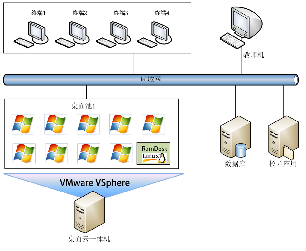 假设一个学校有100个教师办公,三个电教室,每个教室56个桌面。方案的总体架构如下: